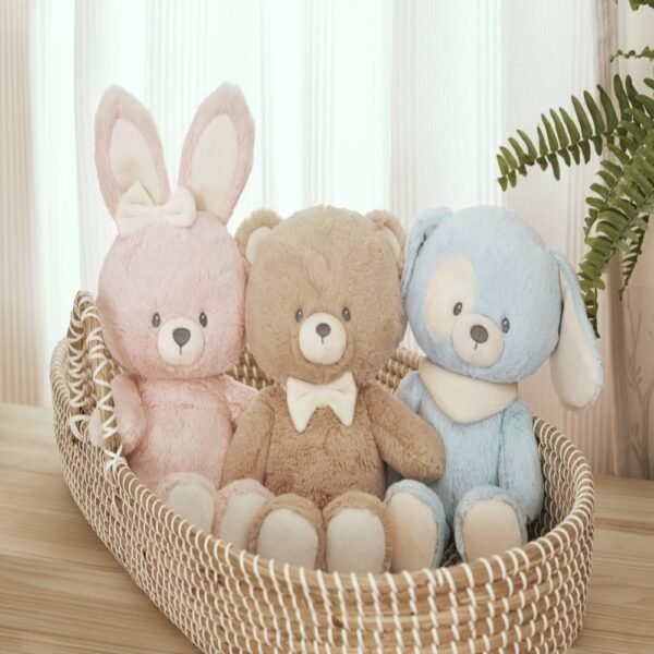 aby GUND is proud to introduce our first line of sustainably soft friends, sourced from 100% recycled materials! Each friend is crafted with luxe, ultra-soft recycled plush, fiber fill, thread, and pre-consumer recycled beads. Only recycled packaging and labels were used. Each plush pal is also adorned with super-cute, baby-safe accessories: Roise the pink bunny and Clove the brown teddy bear sport super-soft cream-colored bows, and Bay the blue puppy wears a soft bandana playfully around his neck.
