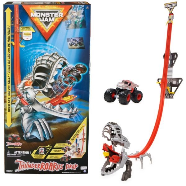 Get ready for action with the Monster Jam ThunderROARus Drop Playset! Standing an impressive 6 feet high, this is the tallest Monster Jam playset ever, designed to bring epic stunts right into your home.