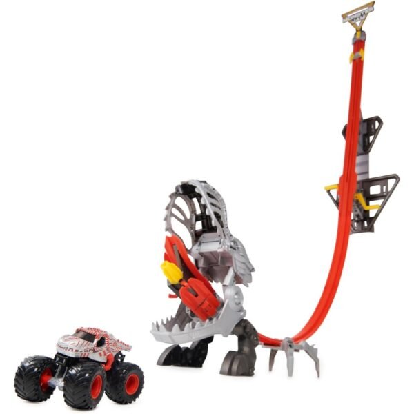 Load up your Monster Jam trucks and crank the handle to watch them ascend the towering playset. Once at the top, release the truck to perform incredible stunts including a high jump, front flip, and corkscrew as it launches from the Dino’s mouth, complete with thrilling lights and sounds!