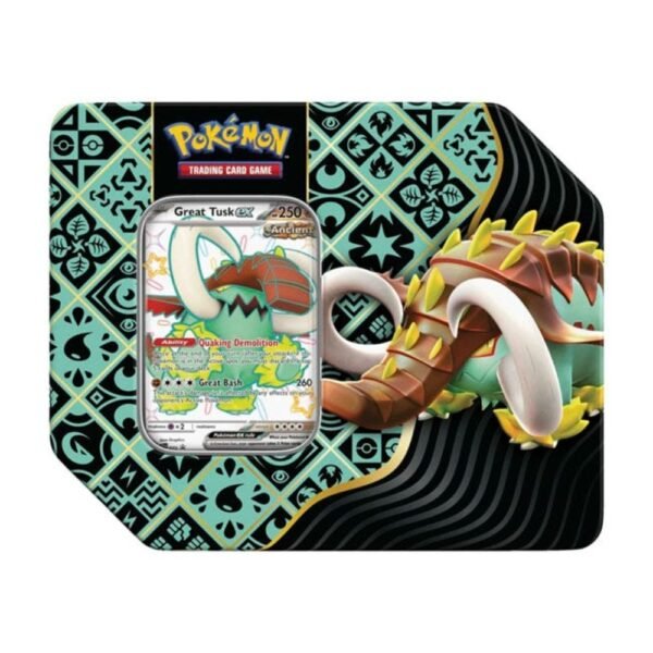 Unleash the breathtaking power of Shiny Pokémon ex with the Scarlet & Violet – Paldean Fates tin! Choose the quaking force of Great Tusk ex as your Ancient Pokémon and dive into a treasure trove of cards that enhance your gameplay and collection.