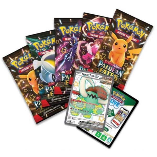 In this stunning tin, you’ll find the powerful Great Tusk ex, ready to dominate the battlefield with its unique abilities. Alongside this promo card, you’ll discover five Scarlet & Violet – Paldean Fates booster packs, each filled with opportunities to expand your deck with exciting new Pokémon and Trainer cards. Whether you’re battling against friends or collecting, this tin is a must-have for any Pokémon enthusiast.
