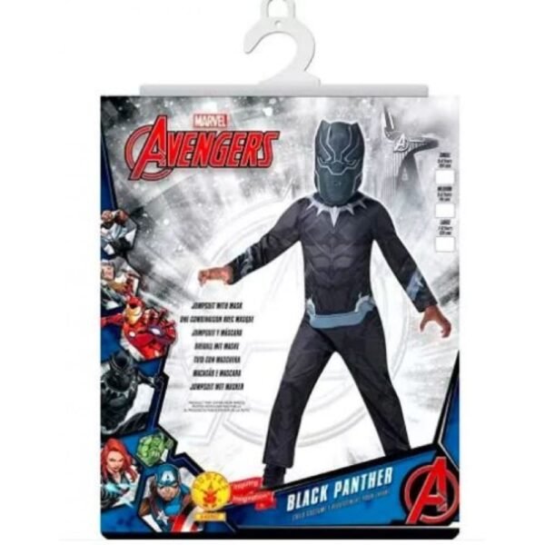 Rubie’s Costume. Available in child sizes Toddler 2-3, S 3-4, M 5-6, L 7-8 and Age 9-10 years please check size guide before purchase You are TChalla, heir to the ruling dynasty of Wakanda. Once inside this printed jumpsuit, prowling behind the Black Panther mask, you may find you too become a master tactician and tracker with an acrobatic fighting style.