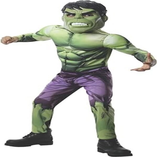 Marvels official children?s Hulk fancy dress costume by Rubies, transforms even the calmest kid into the mean, green rage machine. The Hulk?s strength remains at the top level of all super human beings on Earth and this strong looking costume will make you Hulk-Out when needed for parties, Halloween or the daily routine of saving the planet from the powers of evil. Featuring a vibrant jumpsuit design with attached shoe covers and detailed Hulk half mask, you?re just a few clicks away from a transformation into one of the most iconic and powerful Super Heroes in the world!