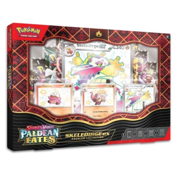 Capturing a Shiny Pokémon is a remarkable achievement, and this collection helps you expand your arsenal with three stunning shiny Pokémon: Shiny Skeledirge ex, Shiny Fuecoco, and Shiny Crocalor. Shiny Skeledirge ex boasts a powerful dual-attack ability, capable of both healing and dealing damage with its fiery voice.
