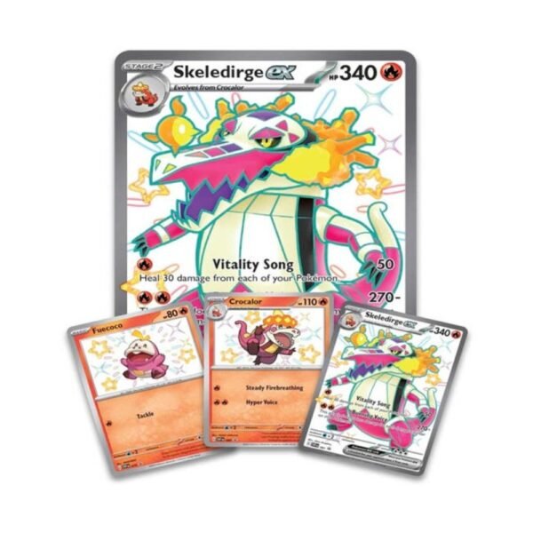 - Three Promo Cards: Shiny Fuecoco, Shiny Crocalor, and Shiny Skeledirge ex, displayed in a magnetic 3-card protector to showcase the full evolution chain.