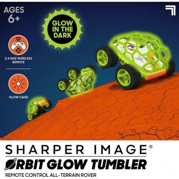 Light up the night and rule any terrain with the Sharper Image RC Orbit Tumbler Glow In The Dark! Designed for jaw-dropping stunts and thrilling off-road action, this remote-control car features a rounded glow-in-the-dark cage, LED lights, and oversized monster truck wheels for high-speed flips and somersaults.